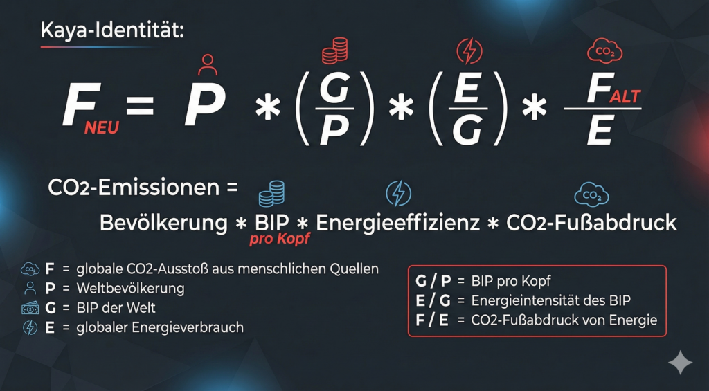 Die Kaya-Identität spielt für die Klimaforschung eine zentrale Rolle bei der Entwicklung zukünftiger Klimaszenarien. Nach dieser Formel werden die globalen CO₂-Emissionen von vier Faktoren getrieben: