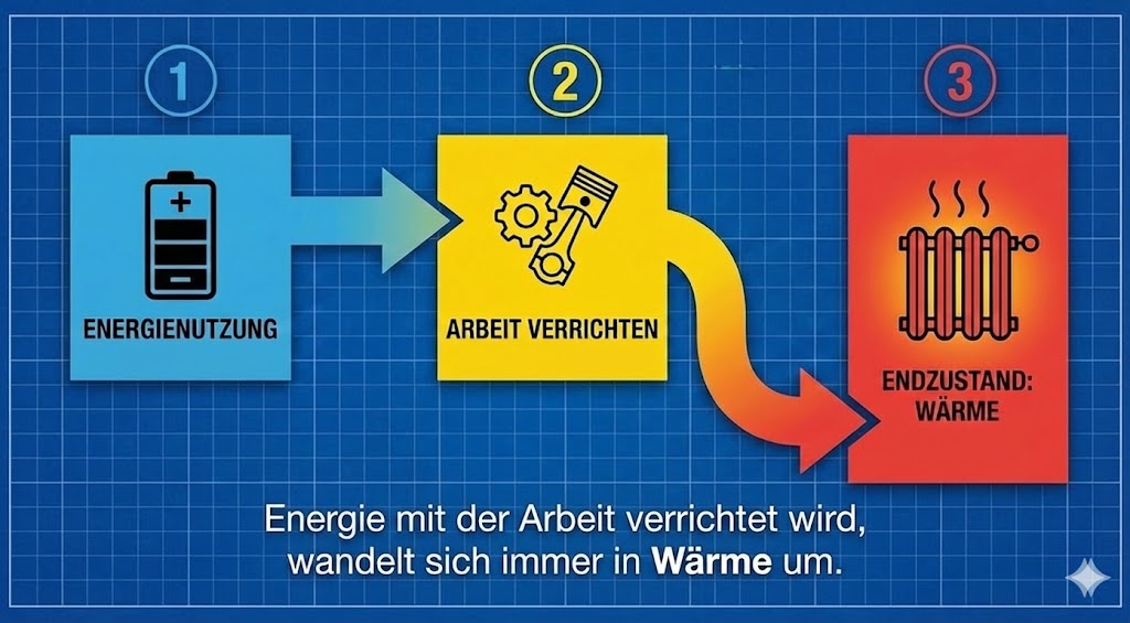 Um die Endgültigkeit unseres Problems zu verstehen, müssen wir die Ökonomie kurz verlassen und die Physik betrachten. Der Zweite Hauptsatz der Thermodynamik sagt: Jede Energie, mit der Arbeit verrichtet wird, verwandelt sich am Ende in Wärme. Ein Rechenzentrum, das rechnet, oder ein Auto, das fährt – sie alle wandeln ihre genutzte Energie (Strom aus Windrad, chemische Energie aus fossilen Brennstoffen) über kurz oder lang zu 100 Prozent in Wärme um.