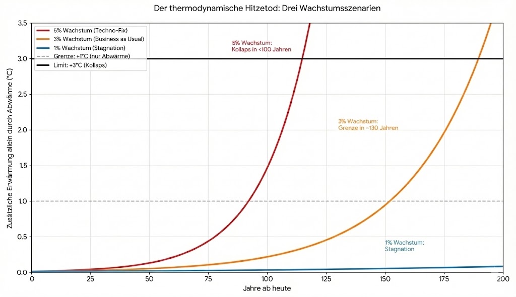 - Szenario 2: Grünes Wachstum Wir wachsen ökonomisch moderat weiter (zwei bis drei Prozent BIP-Wachstum, was historisch mit einem ähnlichen Wachstum unseres Energiebedarfs korreliert), tauschen aber Fossile gegen Erneuerbare. Auch bei „grünem“ Wachstum summiert sich die „Abwärme“ unserer technologischen Gesellschaft exponentiell und wir erreichen die Hitzemauer in etwa 150 Jahren. Wir gewinnen etwas Zeit, ändern aber am Ergebnis nichts. Das ist kein nachhaltiger Weg in die Zukunft.